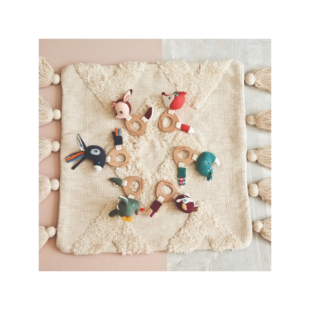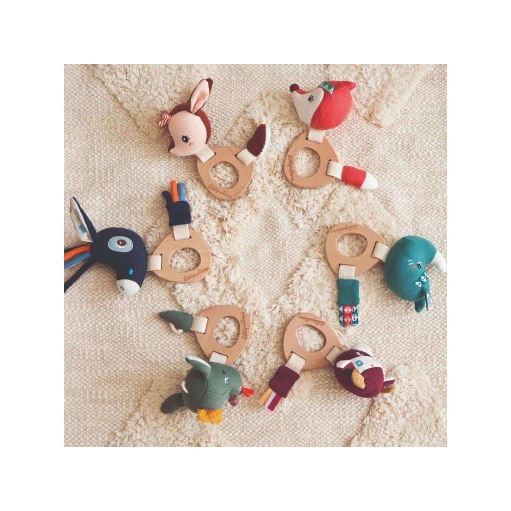 Roztomilá přátelská tvář kravičky Rosalie, veselý zvuk a dřevěný kroužek dělají z tohoto chrastítka zábavný zážitek pro miminka od 3 měsíců.