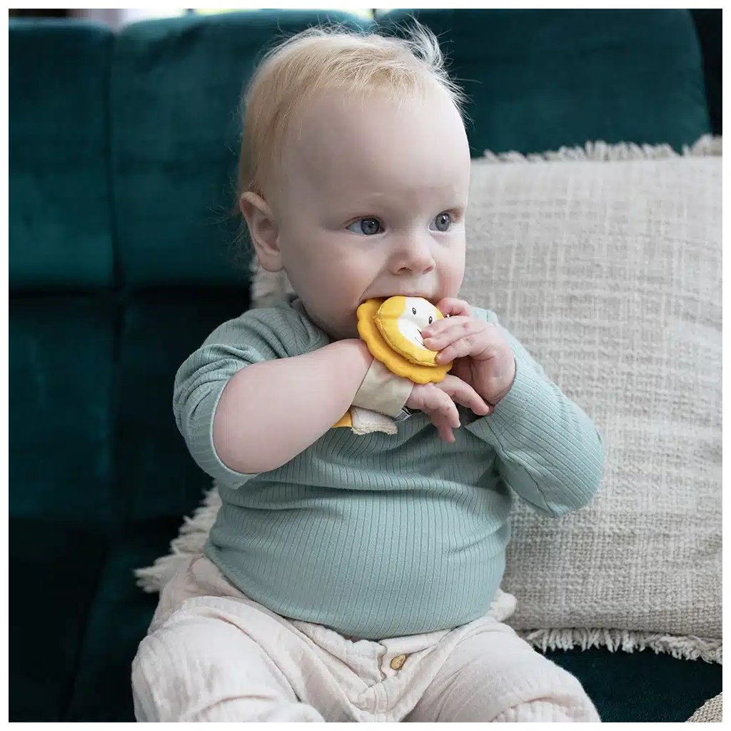Kousátko na zápěstí lvík Ludo je vyrobeno z měkkého plyšového manšestrového řemínku a žvýkací silikonové hřívy. Kousátko jednoduše připevněte děťátku kolem zápěstí pomocí suchého zipu a sledujte, jak si užívá zklidnění bolavých dásní. Povzbuzuje dítě, aby samostatně zvládalo bolest při prořezávání zoubků. Barevné senzorické stužky stimulují smysly dítěte při prořezávání zoubků. Možnost prát v pračce.