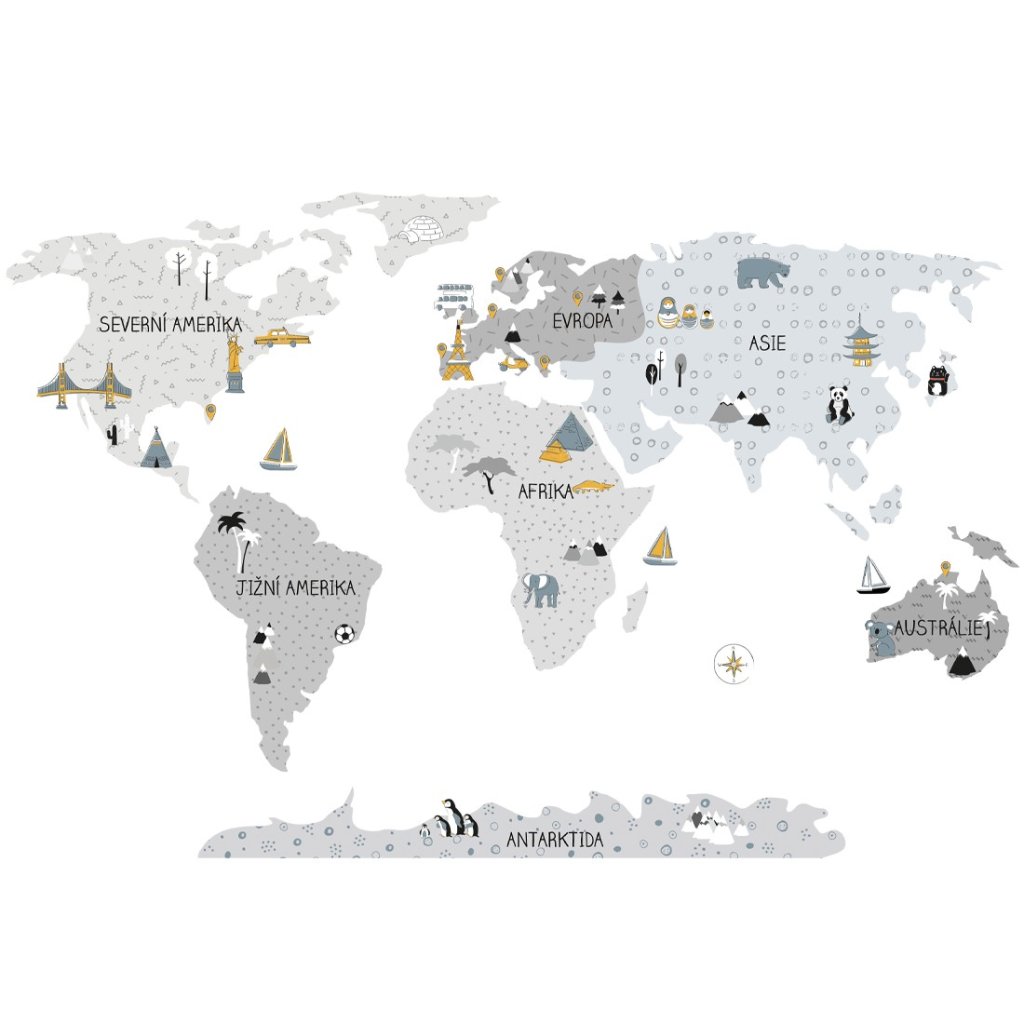 Mapa světa je produkt nejvyšší kvality, vyrobený s maximální péčí a citem pro detaily, v tlumených skandinávských barvách, které dokonale splynou s dětským prostorem. Mapa není jen jedinečnou ozdobou, ale také senzačním způsobem učení hrou. Děti poznávají kontinenty, oceány, stejně jako památky a zajímavosti daného regionu nebo státu. Díky speciálním doplňkovým samolepkám si také mohou označit místa, která již navštívily nebo kam by se chtěly v budoucnu vydat. Každý prvek mapy je pečlivě vystřižen z obrysu a slepen samostatně, což usnadňuje aplikaci, zejména v případě velkých prostor. Velikost nálepky se měří po jejím nanesení na zeď, přičemž kontinenty jsou od sebe v příslušné vzdálenosti. Pečlivě jsou také vystřiženy vzdělávací prvky, díky nimž děti nemusí používat nůžky a nálepku mohou velmi snadno umístit na dané místo na mapě. Samolepka je zajištěna speciálním matným laminátem, který ji chrání před poškrábáním při každodenním používání a také usnadňuje lepení - fólie je silnější a snáze se přenáší na zeď. Tato sada obsahuje: kontinenty, ostrovy a další (vzdělávací) prvky. Sada je k dispozici ve 3 velikostech: S (90 x 60 cm), M (130 x 85 cm), L (180 x 120 cm).